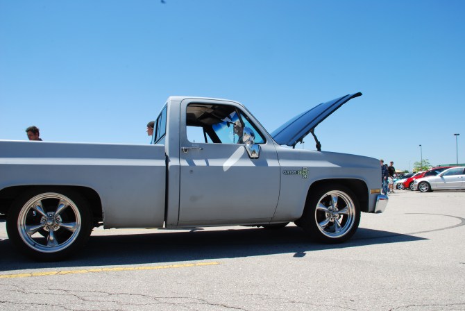 Trucks are sweet too. Mustang rims on a Chevy(?). Down right American.