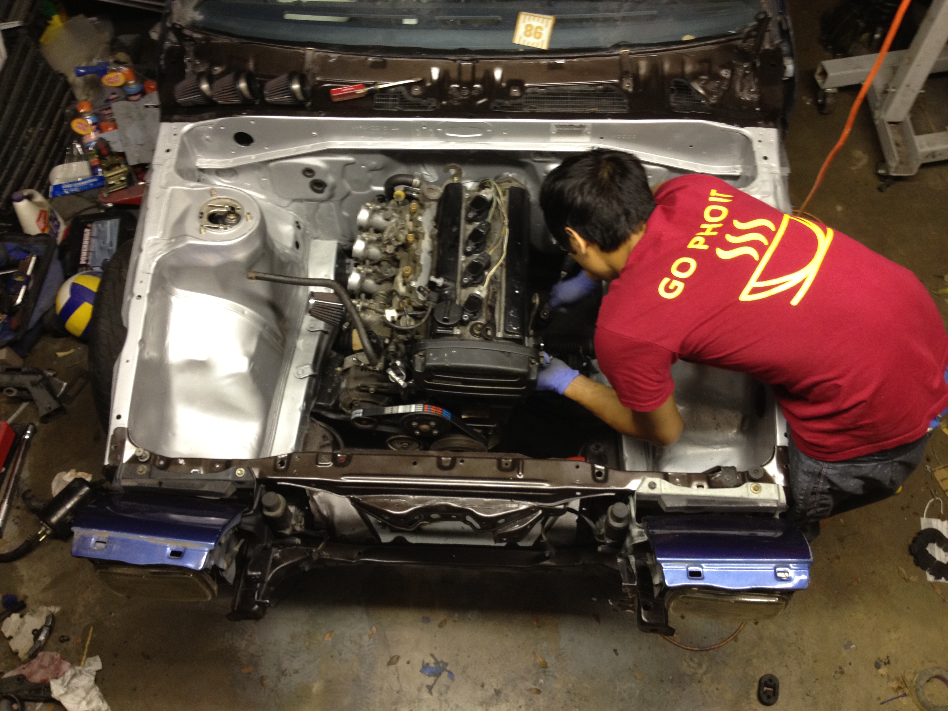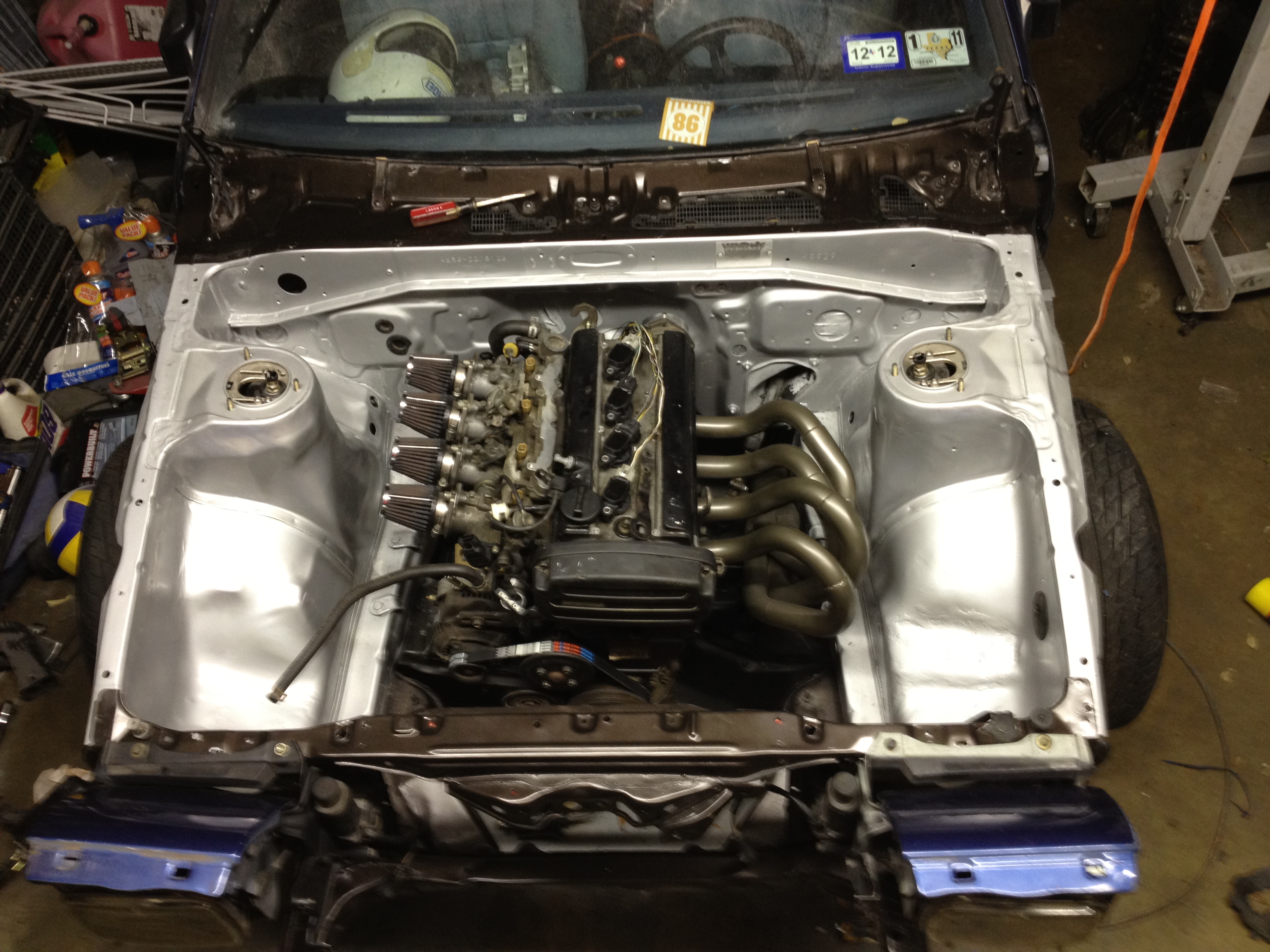 After a couple tweaks here and there, I got the headers in just to see what it would look like!  (in case you’re wondering about the headers, I got them used from club4ag.  they’re old JSP Fab headers.  Made by Formula Drift driver John Russakoff.  I think he might have run them in his old 20v competition 86)