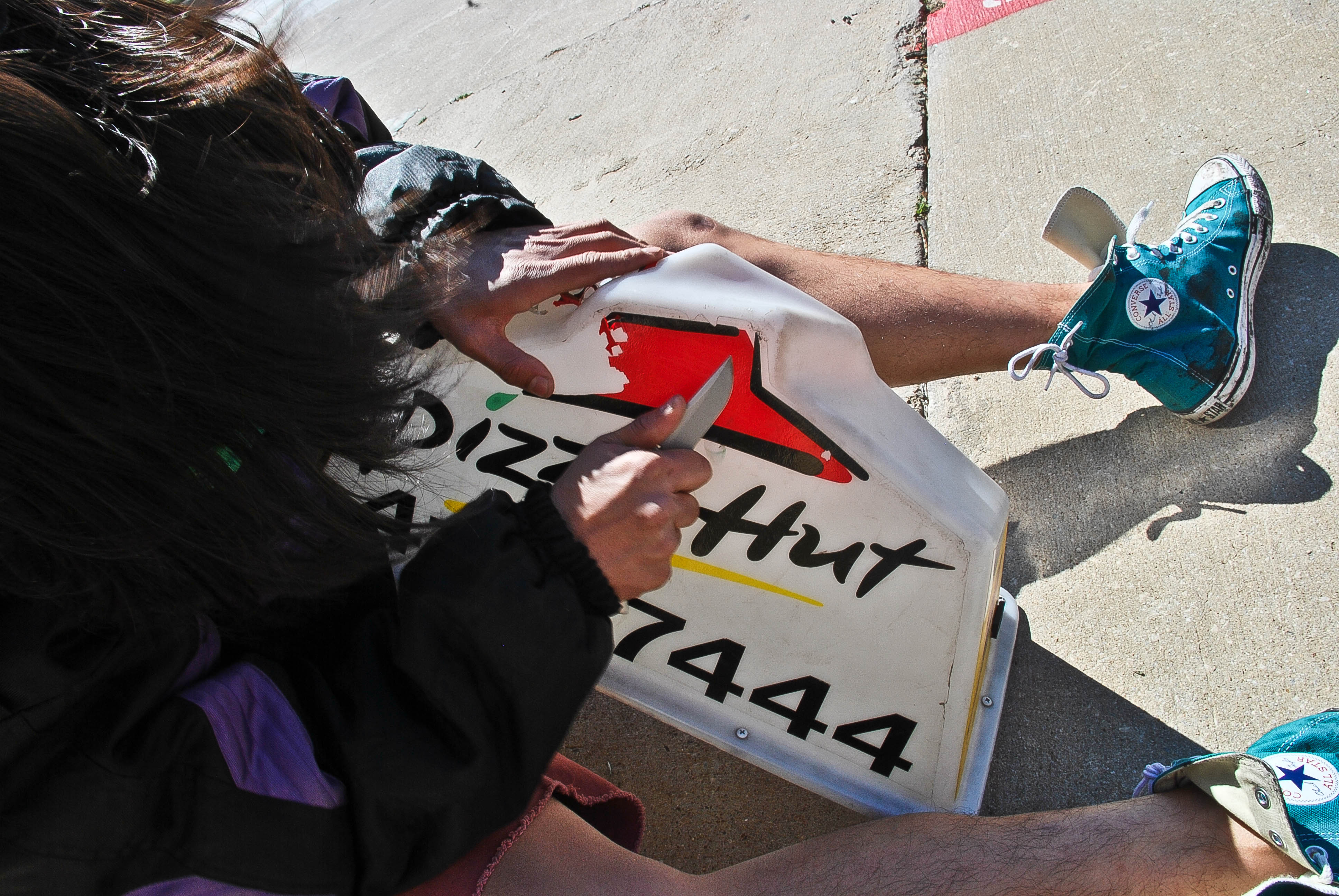 We have a theme of working on pizza delivery signs for advertisement for Natsukashi Garage so Thaison went to work on clearing off this Pizza hut jazz