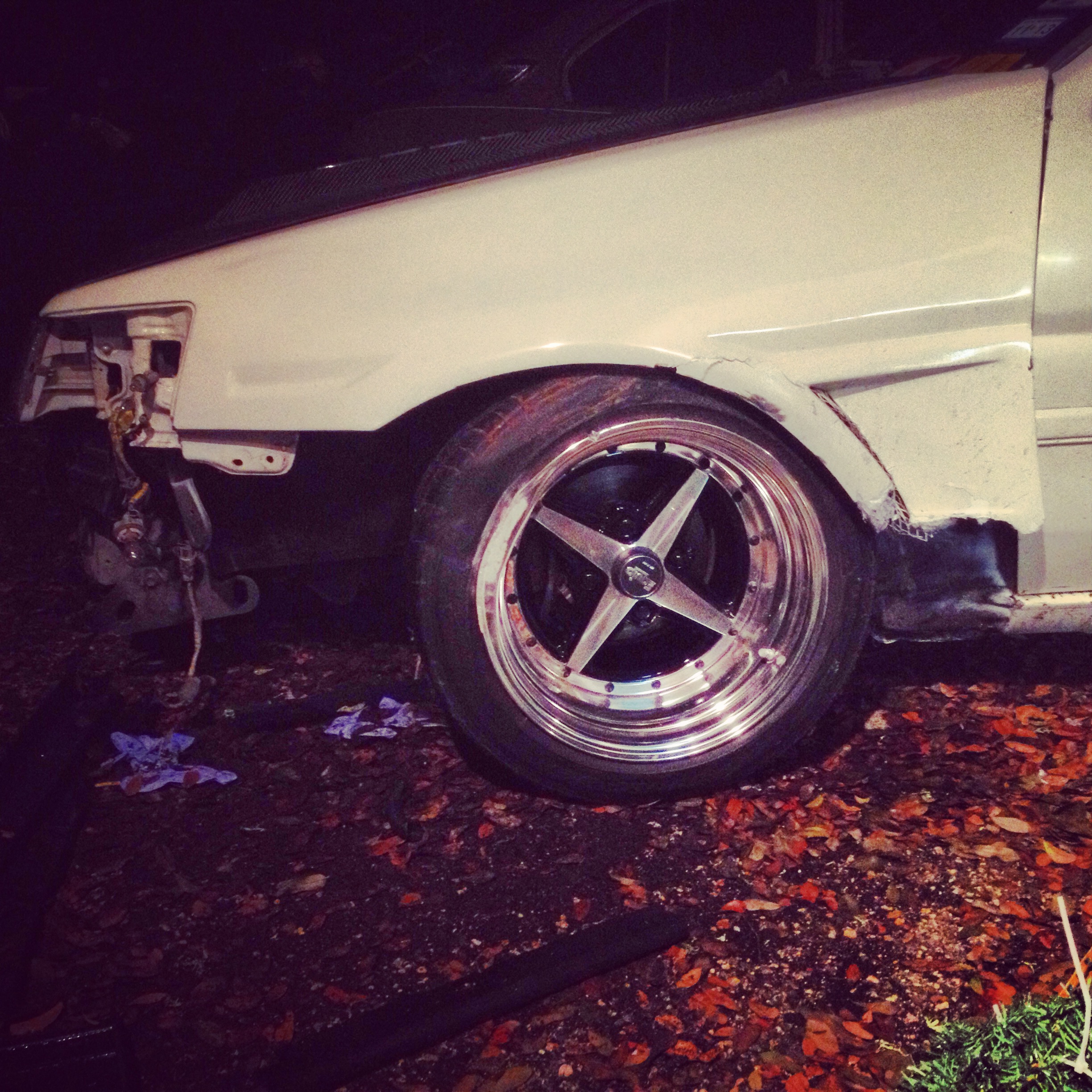 I knew that with the 205/50 tires that were on the 15×9’s that there would be NO WAY they could clear the flares. So rather than buying new tires, here’s what I decided to do on a whim one day: