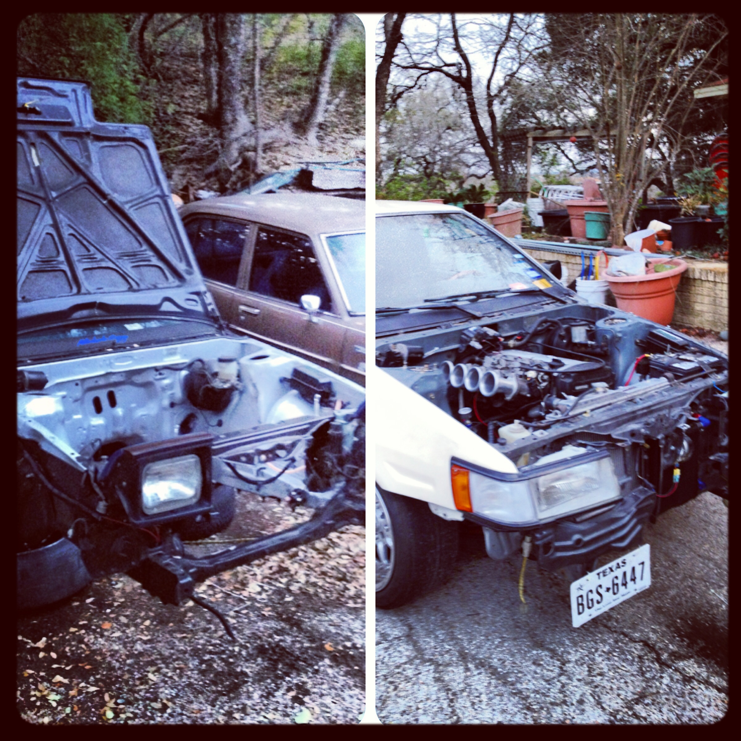 Then I was up late afternoon and wrenching on the car again. I pulled the 20v motor, harness, & tranny out of the hatch and put it to the side of the garage because I had to now swap the ENTIRE front crossmember of the hatch onto the coupe. Lucky for me, Joseph came over after work and let me borrow his fancy electric impact gun. Three bolts from the top of both coilovers and the four crossmember bolts and the coupe’s entire front crossmember was out. Same for the hatch. Time for a switcharoo! With a BUNCH of hammering later (to straighten out bent things from the impact, LIKE THE FRAME RAIL), the front was all put back together, except for the motor/tranny. By 2:30am that night I had the 20v motor into the coupe and started to piece together the little things — harness routing, coil/ignitor mounting locations, distributor wiring. But since I had done it all before in the hatch, it was much quicker this time around.