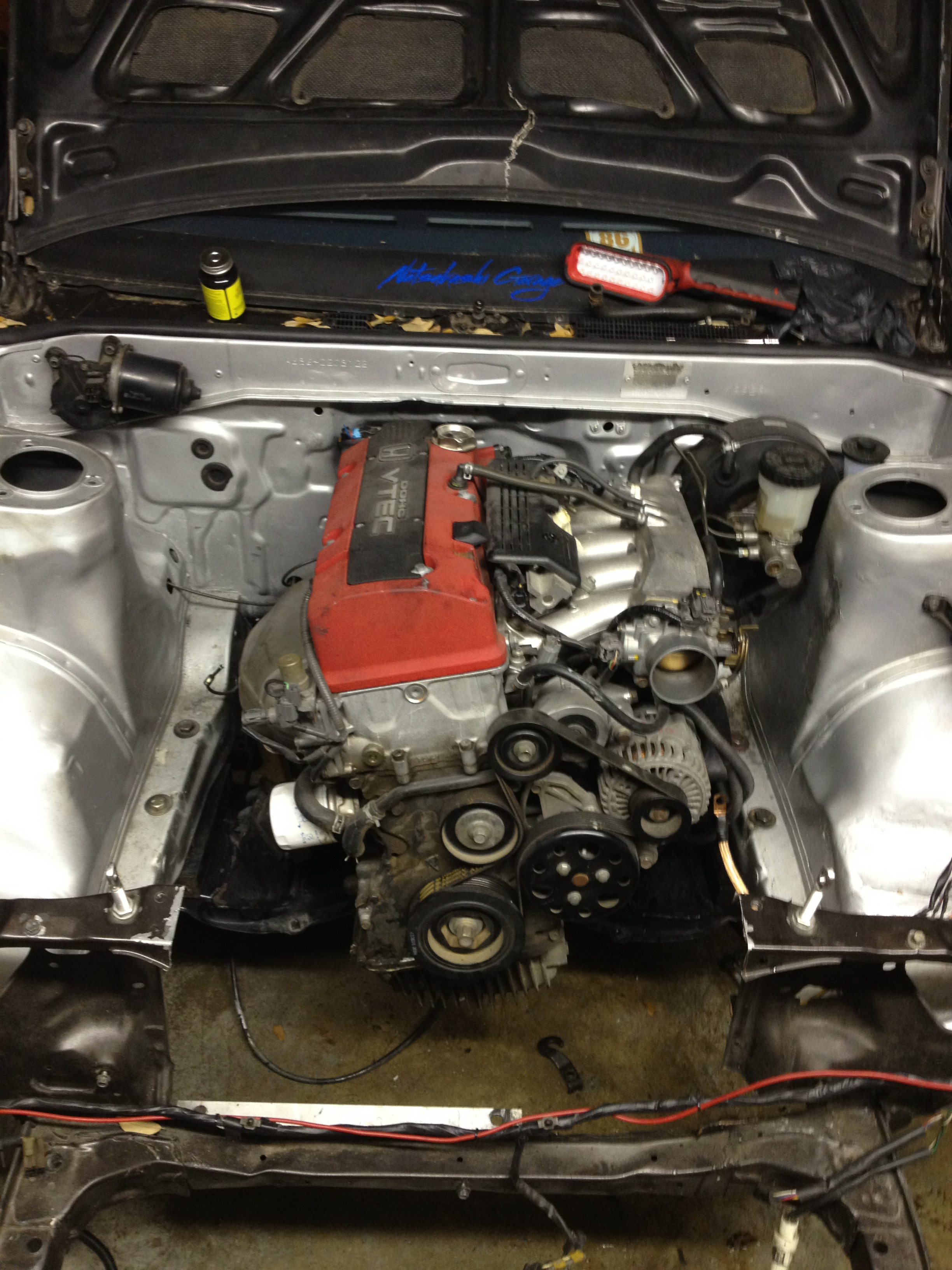 Then it was time to grab the cross-member and bolt it to the chasis with the subframe spacers. In case you didn’t know, for the f20/f22c swaps, you have you drop the front subframe ~1.75″ unless you plan on making a new transmission tunnel and hood. The motor and tranny are substantially larger than the puny stock transmission and 4age. I also ended up cutting the front radiator/core support for ease of swap.