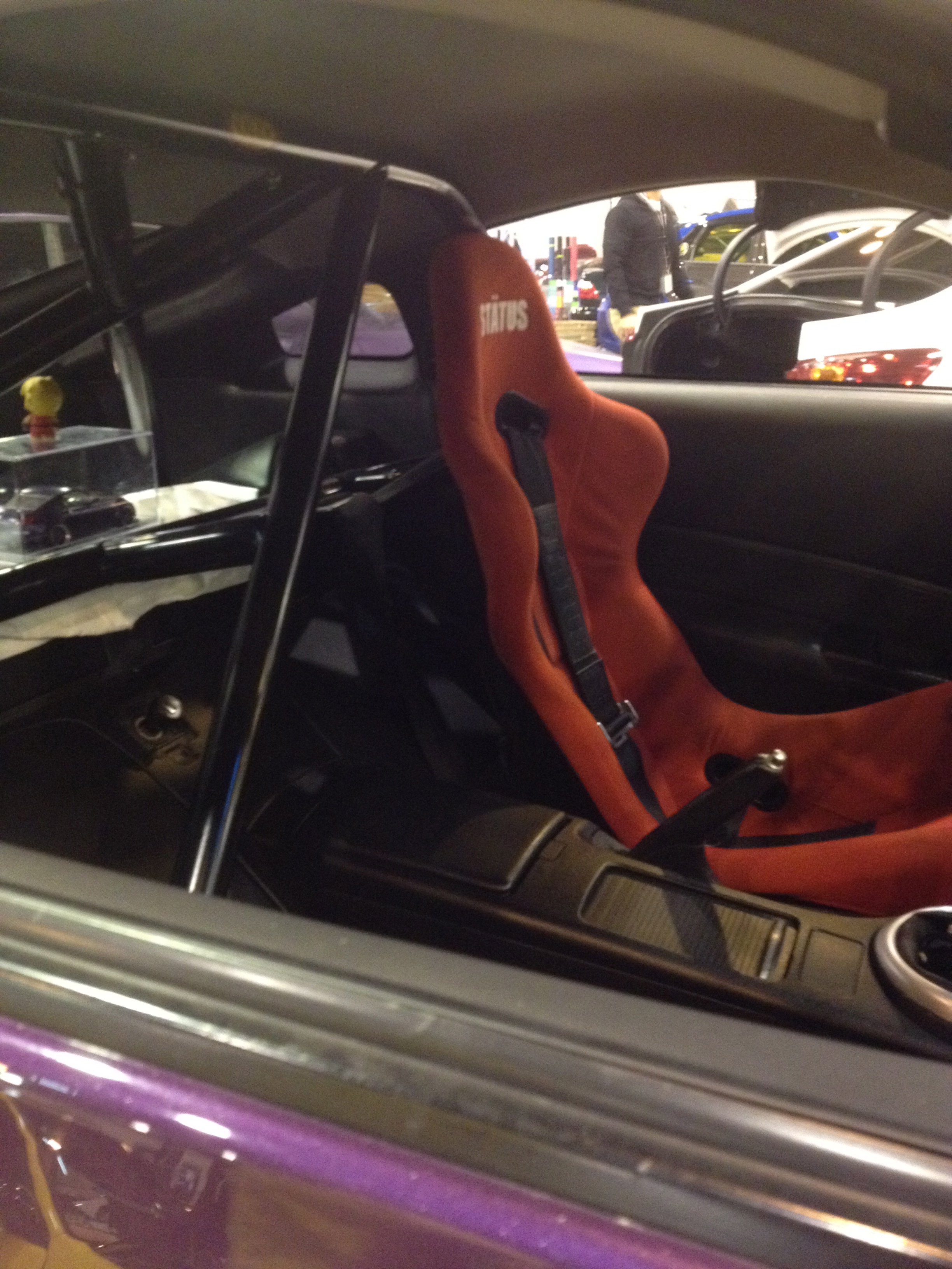 This 350Z originally had overfenders, but then the owner molded it to fenders to make one piece but still kept the rivets. The racer theme carried to the interior.